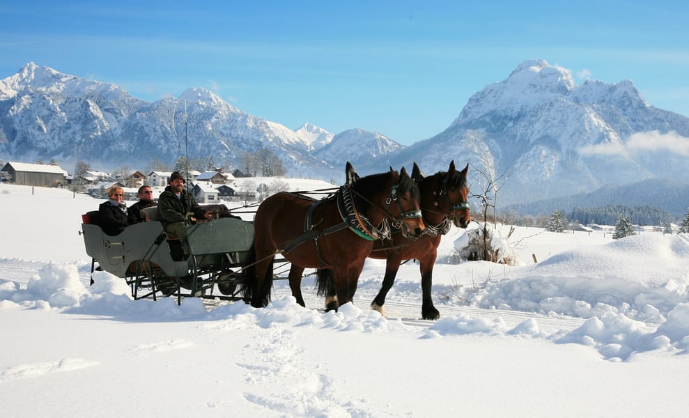 Der Futterplatz lässt sich vom Schwangauer Ortsteil Brunnen aus bei einem Wintersparziergang in rund einer halben Stunde erreichen. Noch mehr Winterzauber verspricht eine Pferdeschlittenfahrt dorthin. Gemütlich in warme Decken gehüllt und begleitet durch das Läuten der Schellen, gleitet man durch die Schneelandschaft.