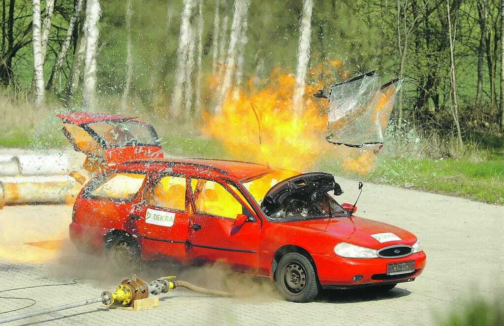 Welche explosive Kraft zum Beispiel in Propangas steckt, das im Sommer in vielen Gasgrills zum Einsatz kommt, hat die Dekra auf einem Testgelände simuliert. Dabei reichte der Funke der Zentralverriegelung, um eine Explosion auszulösen, die das Testfahrzeug in tausend Stücke riss.