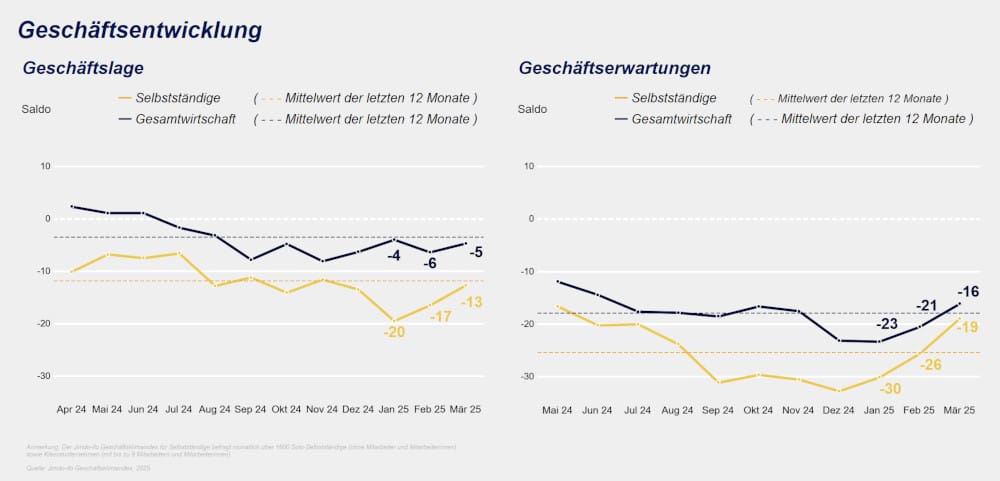 So lag der Jimdo-ifo-Geschäftsklimaindex im März 2025 bei -15,8 Punkten. Einen Monat zuvor lagen die Werte, die die Wirtschaftsforscher des Münchner ifo-Instituts in Auftrag von Jimdo jeden Monat in Umfragen bei Selbstständigen und Betrieben mit bis zu neun Mitarbeitern ermitteln, noch bei -21,1 Punkten. Etwas erholt haben sich damit sowohl die aktuelle Geschäftslage, als auch die Erwartungen für die nächste Zeit.