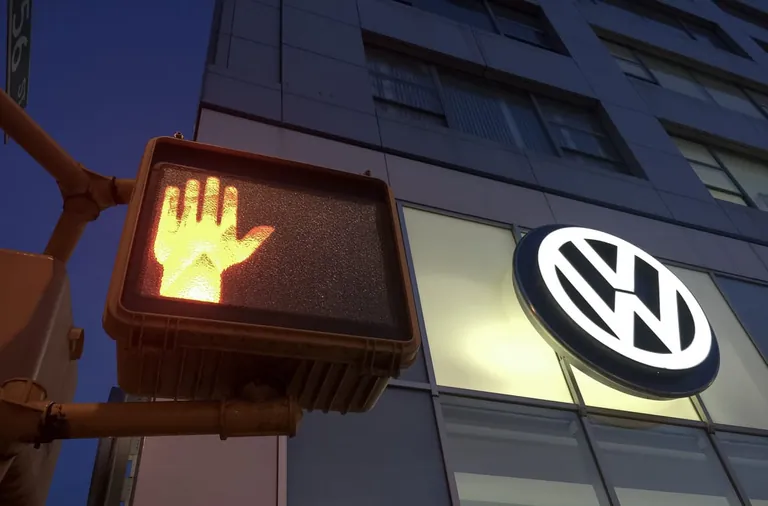 Rote Ampel für VW: Wissenschaftler aus den USA brachten die Manipulationen von Abgaswerten bei VW-Diesel-Motoren ans Licht. Hier leuchtet das Logo von Volkswagen an der Fassade der Niederlassung "Manhattan" in New York neben einer roten Fußgängerampel. - © Foto: Michael Kappeler/dpa