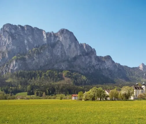 Die Kirche St. Lorenz vor der Drachenwand. Foto: Salzkammergut Tourismus Marketing
