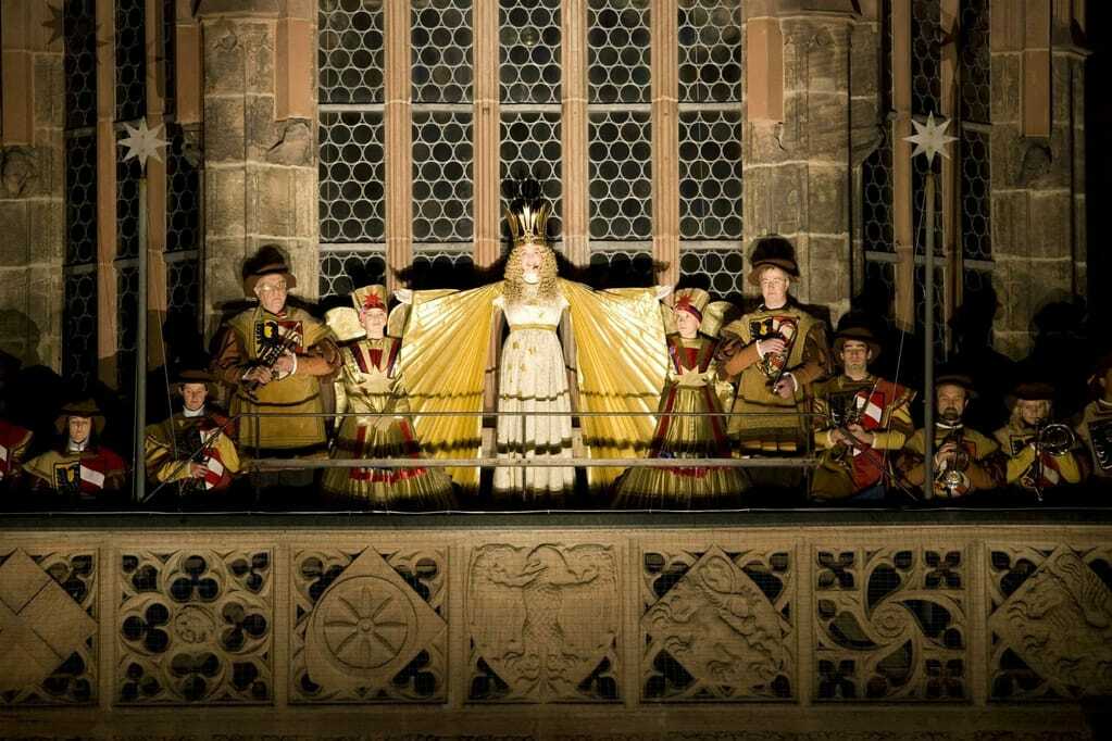 Der Hauptmarkt liegt im Dunkeln, alle Augen richten sich auf die erleuchtete Empore der Frauenkirche. Und dann erscheint es, das Nürnberger Christkind mit weißem Kleid, goldener Krone und blonden Locken und spricht: "Ihr Herrn und Fraun, die Ihr einst Kinder wart, Ihr Kleinen, am Beginn der Lebensfahrt, ein jeder, der sich heute freut und morgen wieder plagt: Hört alle zu, was Euch das Christkind sagt!"