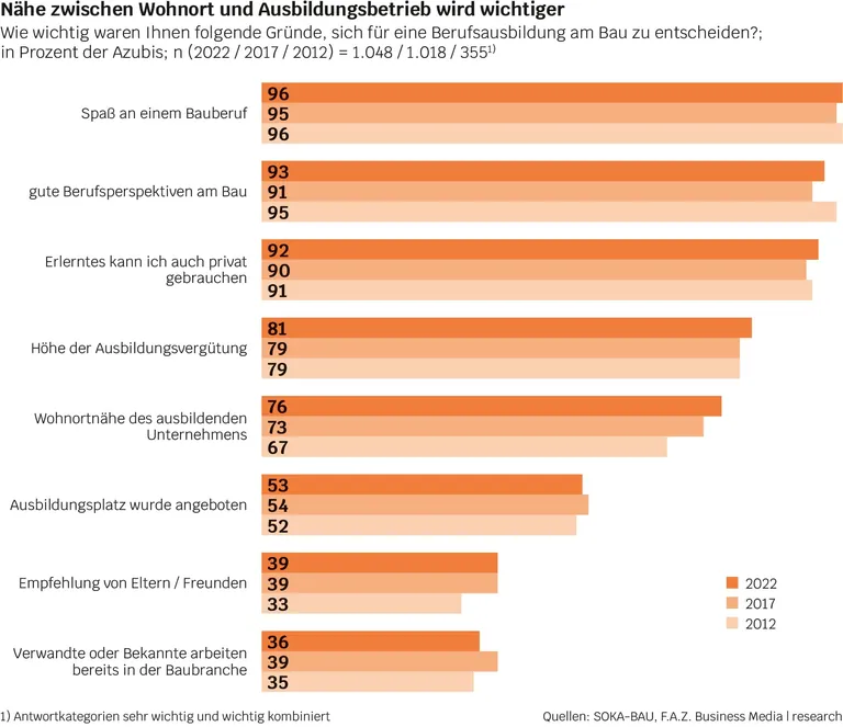 Gemeinsam mit F.A.Z. Business Media untersuchte die Soka-Bau zum dritten Mal, wie junge Berufsanfänger aus der Baubranche auf ihre Lehrstelle aufmerksam wurden und ob sie zufrieden mit ihrer Berufswahl sind. Auf die Frage, weshalb sie sich für eine Berufsausbildung am Bau entschieden, nannten die meisten Befragten die Freude an der Tätigkeit. Ebenfalls wichtige Kriterien für Auszubildende waren die guten Berufsperspektiven und der private Nutzen der erlernten Fähigkeiten – diese nannten sie sogar noch häufiger als die Ausbildungsvergütung. Deutlich mehr Wert legen junge Berufsanfänger inzwischen auf die Nähe zwischen Wohnort und Ausbildungsbetrieb. Bei der ersten Erhebung im Jahr 2012 werteten noch 67 Prozent der Befragten diesen Punkt als wichtig, heute sind es 76 Prozent.