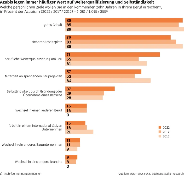 In den kommenden zehn Jahren setzen sich die befragten Azubis vor allem ein gutes Gehalt zum Ziel. Schon bei den Studien in den Jahren 2012 und 2017 belegte dieser Aspekt den Spitzenplatz. Weiterhin wichtig ist den Befragten außerdem ein sicherer Arbeitsplatz, wobei die Bindung an einen einzigen Arbeitgeber zunehmend nachlässt. Stattdessen legen immer mehr Azubis Wert auf eine berufliche Weiterqualifizierung am Bau und streben eine Selbstständigkeit an. Als alarmierend werten die Studienautoren, dass jeder zehnte Azubi plant, seinen Arbeitgeber zu verlassen beziehungsweise die Branche zu wechseln.