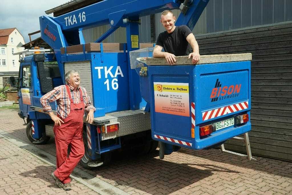 Jammern möchte Falko Schmidt aber nicht, denn sein Betrieb bietet mehr als nur Elektroarbeiten. Das verdankt er vor allem seinem Vater, von dem er das Geschäft Anfang des Jahres übernommen hat. Firmengründer Werner Schmidt baute in den 1920er-Jahren den Tiefbau als zweites Standbein für seine junge Firma auf. Zwei Jahre Abendschule investierte der Elektromeister in die Ausbildung zum Straßenbauer. Dafür konnte er bei lukrativen Aufträgen wie der Installation und Wartung der Straßenbeleuchtung für ganz Meuselwitz die Schachtarbeiten gleich mit anbieten.