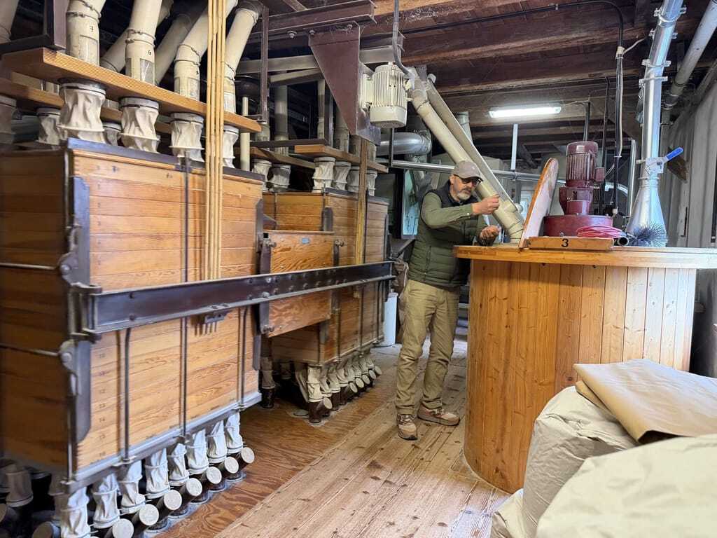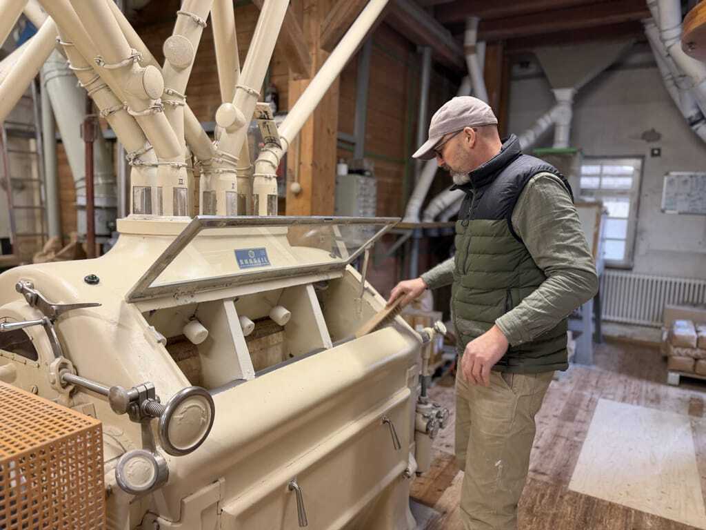 Zuerst sind da die Geräusche: ein tiefes, gleichmäßiges Brummen, das durch Wände und Böden dringt. Selbst im Verkaufsraum ist es zu hören. Dann der Geruch: dezent nach Mehl, nach frischem Korn und nach Wärme, obwohl die Luft kühl ist. Feinster Staub liegt in der Luft, trotzdem wirkt alles sauber. Im Mühlenraum ist das Brummen am lautesten. Hier steht Jürgen Zinßer: braune Kappe, schwarze Brille, wacher Blick. Seine Stimme übertönt das Dröhnen der Maschinen, die Hände sprechen mit. Er wirkt ruhig und wachsam, mit der Selbstverständlichkeit eines Müllermeisters, der sein Handwerk versteht.