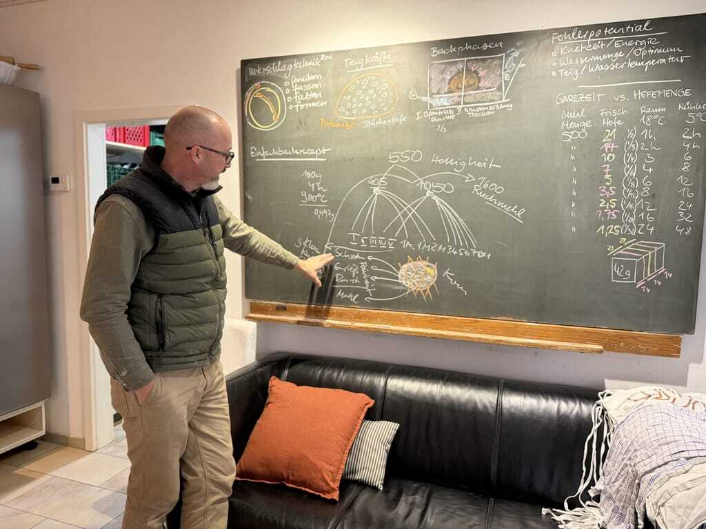 Der Kursraum befindet sich in einem separaten Gebäude. Wo früher der Schweinestall war, ist heute die Schauküche. Seit 2001 gibt Zinßer Backkurse – lange bevor Brotbacken zum Lifestyle-Trend wurde. Über 8.000 Menschen sind bisher gekommen, sogar aus der Schweiz. Er erklärt den Mahlprozess an der Tafel, lässt die Teilnehmer riechen, fühlen und schmecken. "Nicht nur Rezepte lernen", sagt er, "sondern ein Gefühl bekommen." Wasser, Mehl, Salz, vielleicht Hefe: Mehr brauche es nicht. Die Kurse sind wirtschaftlich das stärkste Standbein, aber ohne die Mühle und den Laden nicht denkbar.