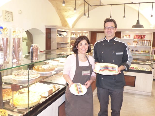 Für einen besonderen "Wow“-Effekt sorgte auch die Präsentation der Landesgartenschau-Torte von Ulf Kretschmer. Diese ist außen weiß und innen farbig. Auf eine besondere Dekoration wurde bewusst verzichtet, Vorbild war das Logo der Gartenschau. Der einzige Unterschied: In der Torte sind die symbolischen Steelen waagerecht in Lagen. Genau genommen besteht die Vanille Creme Torte aus Bisquitböden, gefärbt mit bunten Lebensmittelfarben und gefüllt mit einer fruchtigen Cassis-Vanille-Creme.