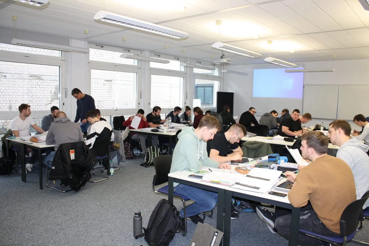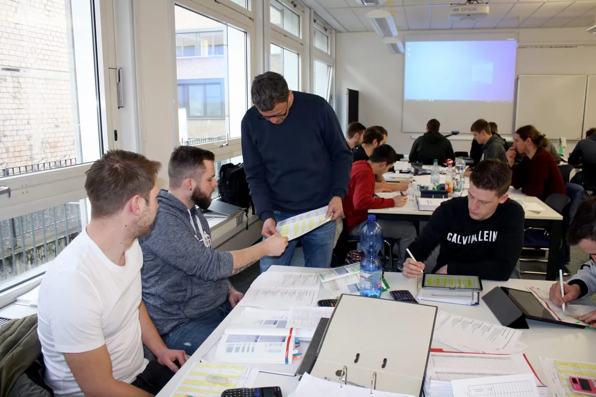In dem Klassenraum in der Würzburger Zellerau ist es ruhig. Lediglich leises Kratzen von Bleistiften über das Papier und hin und wieder das Verschieben der Lineale und Zeichenformen ist zu hören. Etwas über 20 Schüler sitzen hier hochkonzentriert und zeichnen: Rohrleitungen, Elektroleitungen, Anschlüsse an verschiedensten Geräten, Ableseinstrumente und Ventile. Sie alle wollen Meister ihres Fachs werden, in diesem Fall Sanitär-, Heizungs- und Klimatechnik (SHK).
