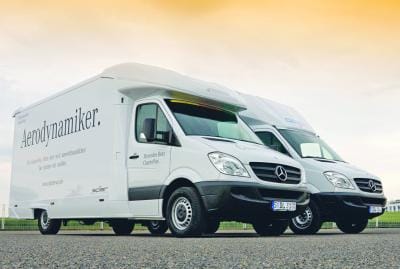 Einen besonders umweltfreundlichen Kofferaufbau gibt es neuerdings für den Mercedes-Benz Sprinter. Die im Windkanal aerodynamisch optimierte „Spier Aerobox“ spart nach Angaben des Herstellers bei Autobahn- und Überlandfahrten Diesel im zweistelligen Prozentbereich. Das hätten Tests bei halber Nutzlast auf einem 600-km-Rundkurs aus Autobahnen und Bundesstraßen gezeigt. Dank der Kraftstoffeinsparungen würde sich der Mehrpreis von 3.000 Euro bereits nach rund 100.000 bis 150.000 km bezahlt machen. Außerdem würde der Schadstoffausstoß deutlich sinken. Die aeordynamischen Vorteile resultieren aus verschiedenen Maßnahmen. So wird zum Beispiel der Koffer ohne Hilfsrahmen direkt am Fahrgestell befestigt, wodurch die Fahrzeughöhe um 200 mm sinkt. Gleichzeitig erhöht sich die Nutzlast um rund 70 kg und die Ladekante in unbeladenem Zustand sinkt von 950 auf 730 mm. Einzige Einschränkung der Aerobox: Aufgrund der niedrigen Gesamthöhe ragen die Radkästen einige Zentimeter in den Aufbau hinein. Die Innenmaße des Koffers betragen bei einem Mercedes.Benz Sprinter mit langem Radstand 4.350 u 2.135 u 2.100 mm.