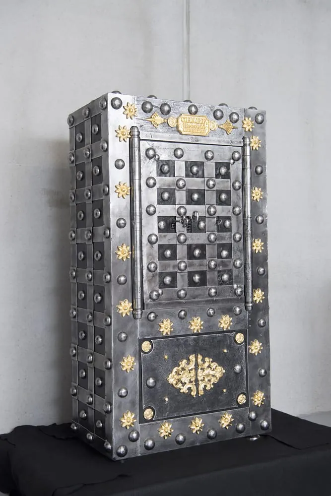 Der Kasten aus dunklem Metall reicht Mark Wilms bis zu den Schultern. Die Vorderseite des Kubus ist mit vergoldeten Blumenelementen verziert. Alles ist auf Hochglanz poliert. Was aussieht wie ein Kunstobjekt, hat aber einen eher praktischen Nutzen: In dem außergewohnlichen Tresor werden Schmuck und Uhren sicher aufbewahrt.