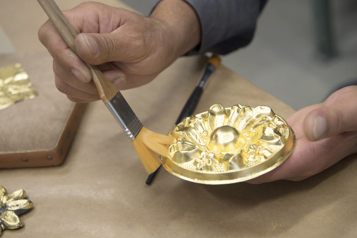 Aktuell arbeiten die Mitarbeiter an zwei weiteren Tresoren für den Kunden aus Singapur. Die Schränke sind etwa 100 Jahre alt und werden nach dem Vorbild des ersten Tresors mit Fingerspitzengefühl restauriert. Schlossermeister Alexander Dieterle und sein Kollege Thomas Schick zerlegen sie komplett und optimieren jedes Teil. Sie lackieren den Holzkörper, verkleiden den Korpus außen mit Metallbeschlägen und überarbeiten den ausgefeilten Schließmechanismus. Im kleinen Raum nebenan beschäftigt sich der gelernte Autolackierer Mihad Hoxhaj mit den künstlerischen Details. Vorsichtig legt er Blattgold auf kleine Blumenformen und drückt das Edelmetall mit einem Pinsel an. Die Blüten schmücken nachher die Vorderseite des Schranks.