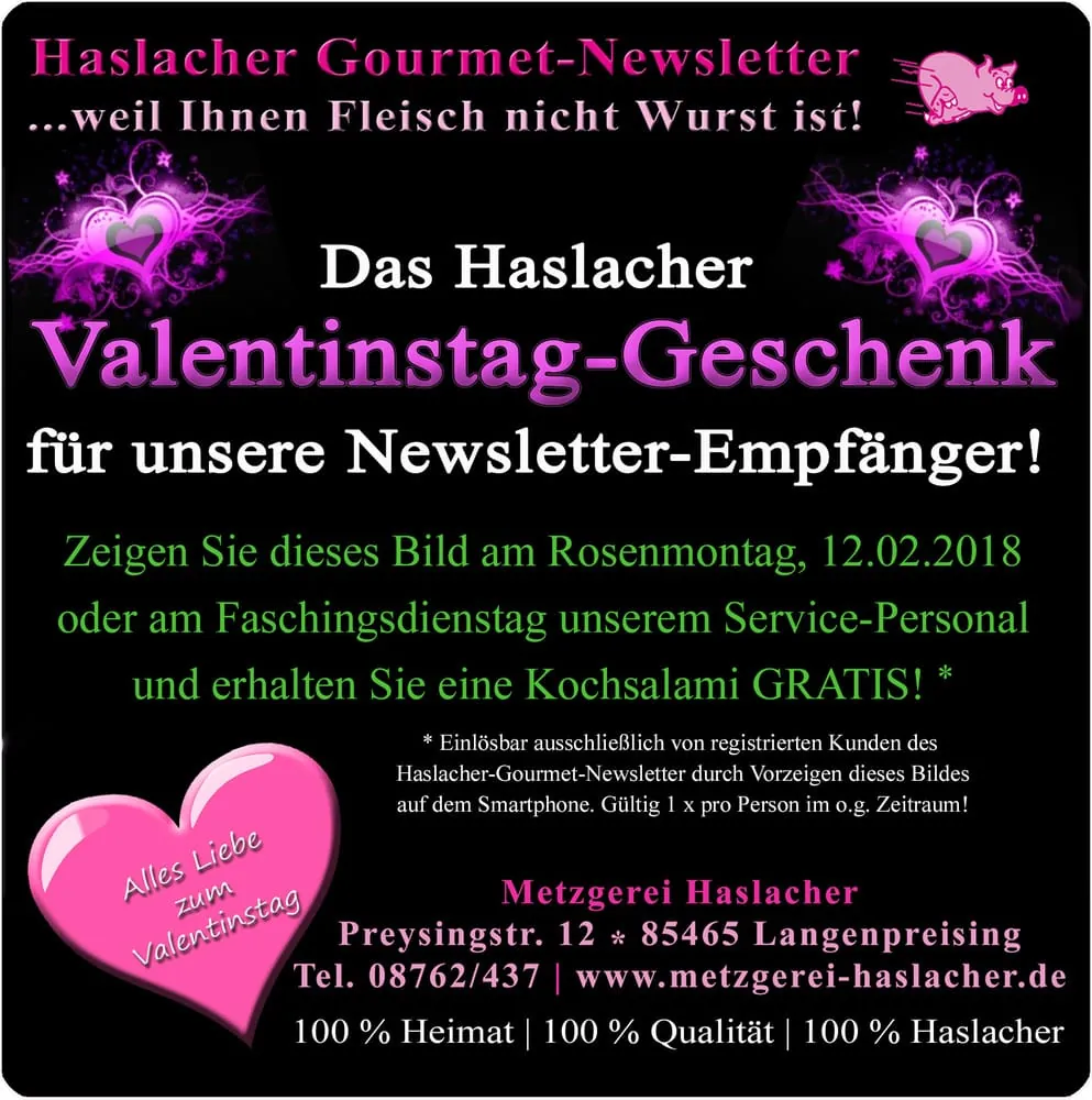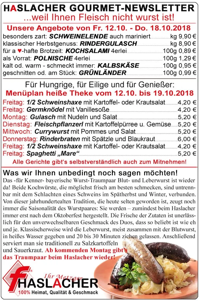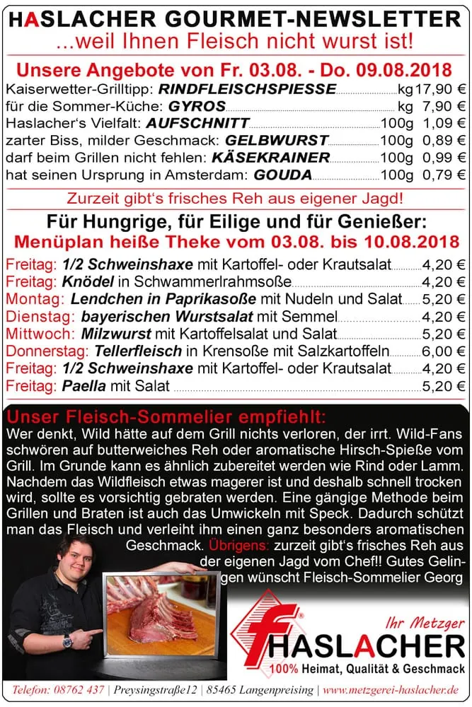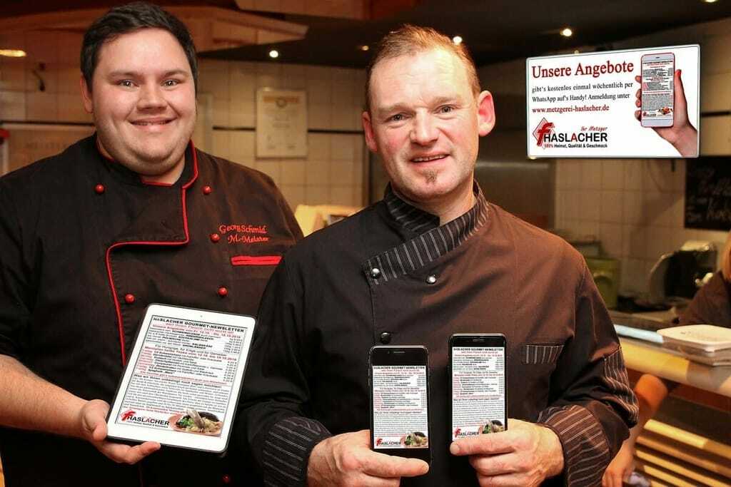 Früher veröffentlichte die Metzgerei Haslacher ihr Wochenangebot hauptsächlich als Anzeige in der lokalen Tageszeitung. Vor eineinhalb Jahren entschied sich Inhaber Anton Haslacher für einen weiteren, moderneren Weg. Kunden der Metzgerei können sich seither für den kostenlosen "Haslacher Gourmet-Newsletter" anmelden. Wer sich registriert, erhält einmal pro Woche ein Foto zugeschickt – per WhatsApp direkt aufs Smartphone. Darauf nachzulesen: Die Angebote der Woche, die aktuellen Gerichte von der heißen Theke und ein "Sommelier-Tipp" von Metzgermeister Georg Schmid.