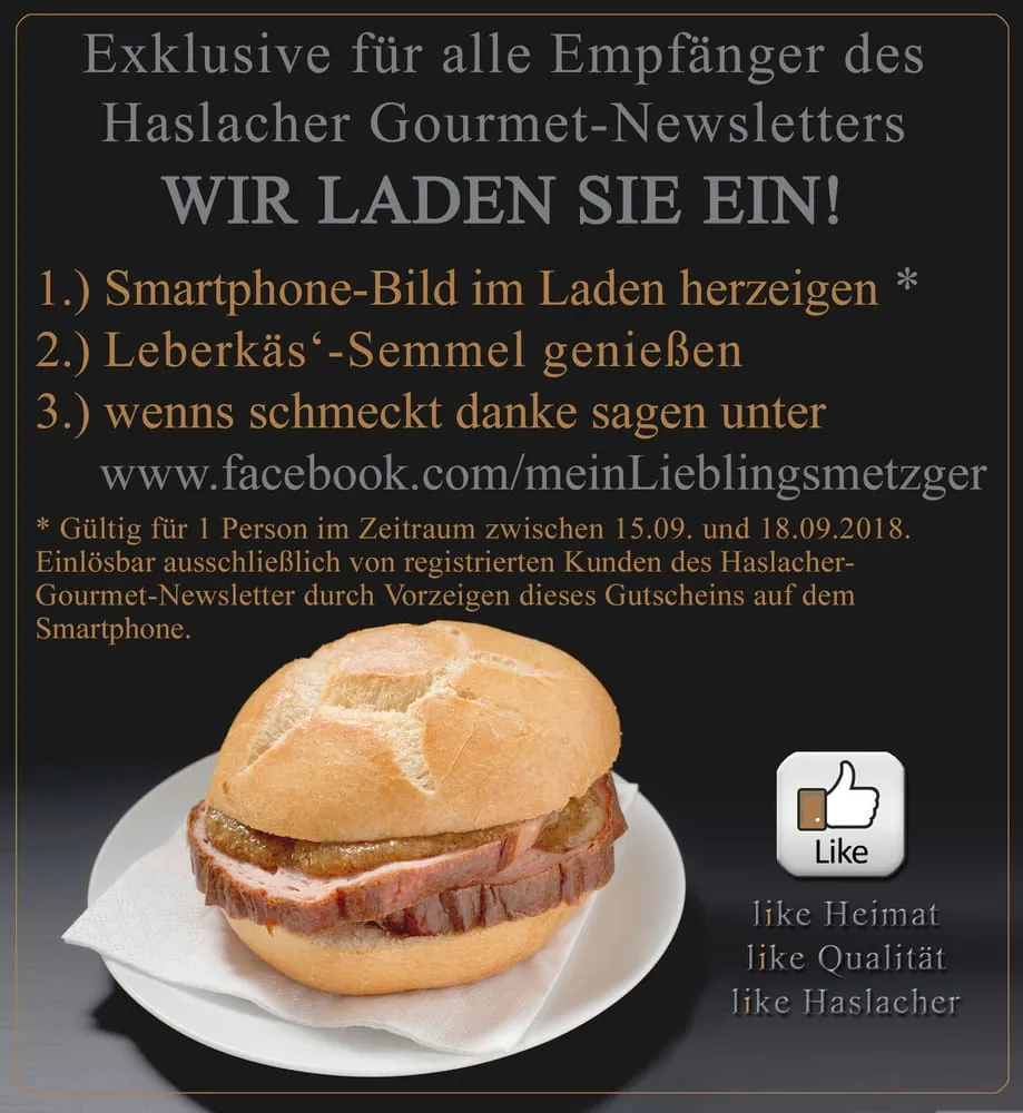Großen Anteil daran, dass sich das Angebot so schnell herumgesprochen hat, haben aber auch die exklusiven Sonderaktionen. Die Metzgerei verschickt beispielsweise immer wieder Coupons an die Empfänger des Haslacher Gourmet-Newsletters. Wer den Gutschein im Laden vorzeigt, erhält einen gratis Leberkäs-Semmel. Rund 30 bis 40 neue Abonnenten gewinnt die Metzgerei durch Aktionen wie diese hinzu. "Natürlich kommt es vor, dass Leute profitieren wollen, die den Newsletter gar nicht abonniert haben", weiß Schmid. Kunden würden die Coupons an Freunde weiterleiten, die den Newsletter nicht abonniert haben. Dies sei jedoch der einzige Wehrmutstropfen.