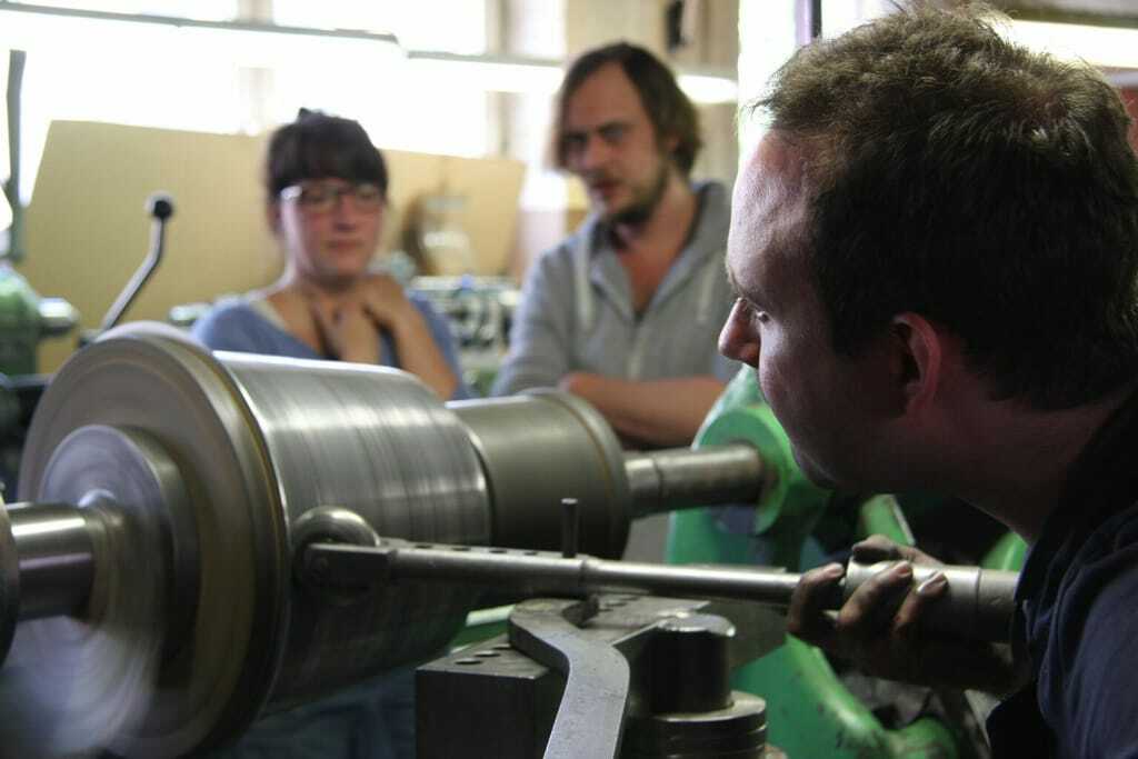 Gespannt schauen sie Geselle Nils Neugebauer über die Schulter, als er eine Aluplatte in den Schraubstock spannt. In einer Schreinerei haben sie zuvor eine Form ihres Lampenschirms aus Holz drechseln lassen, an der das Metall nun entlanggedrückt wird. Nils Neugebauer versetzt die Form in eine gleichmäßige Rotation und fängt an zu drücken. Erst mit einer sogenannten Drückrolle, dann mit der Drückkugel.