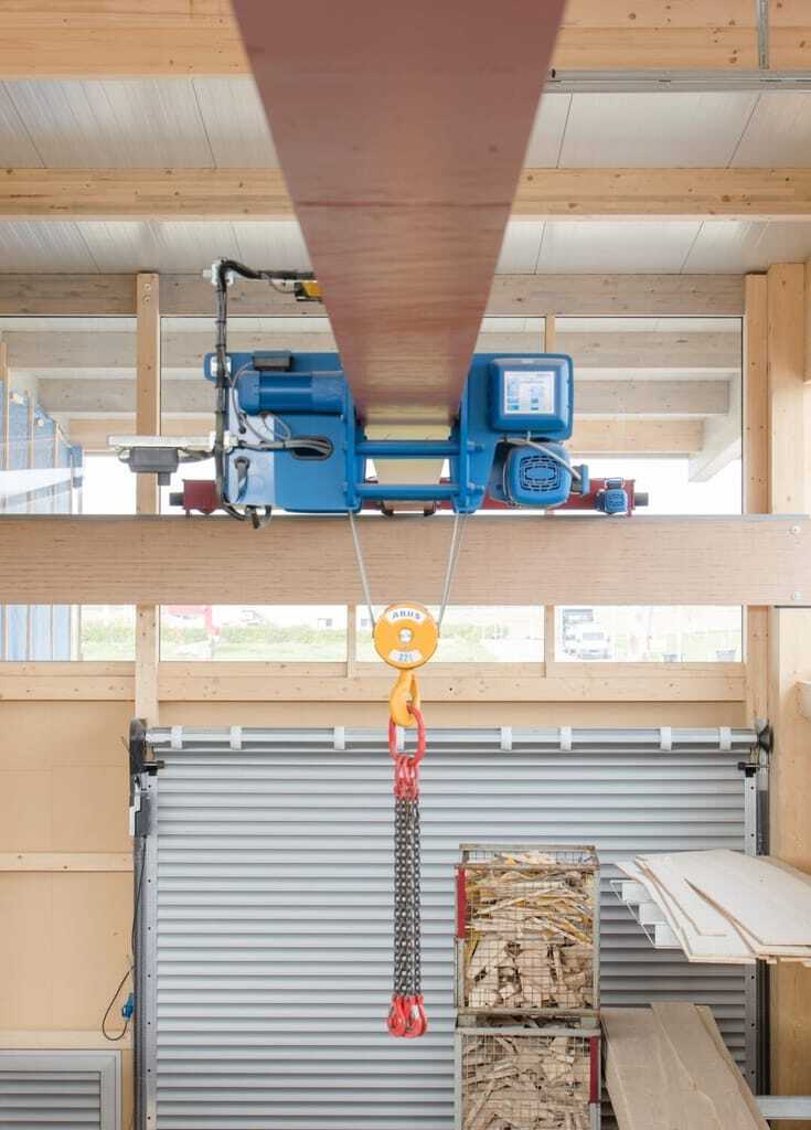 In der Zimmerei Hänsler läuft der Kran mit einer Hublast von 3,2 Tonnen auf 36 Meter langen Trägern aus Baubuche. - © Felix Schelb