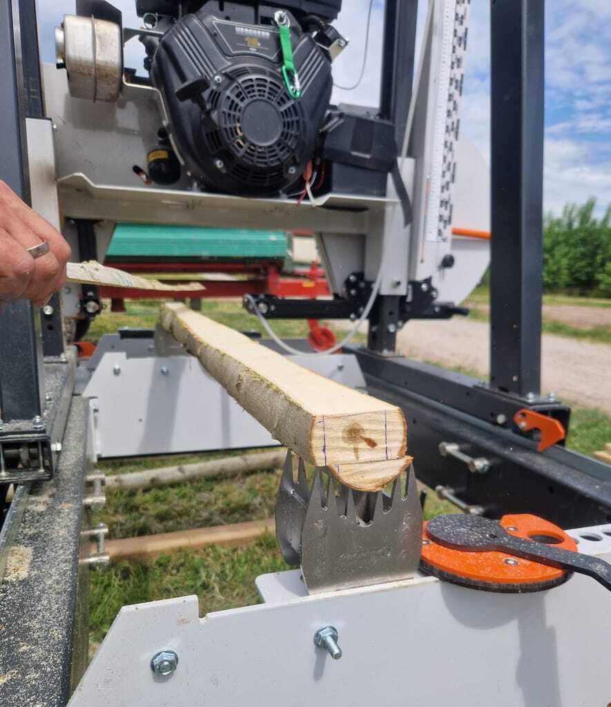 Mit einer mobilen Bandsäge wurden aus den Pappelstämmen Stäbe in Dachlatten­dimension geschnitten. - © Foto: HFR/Schöller