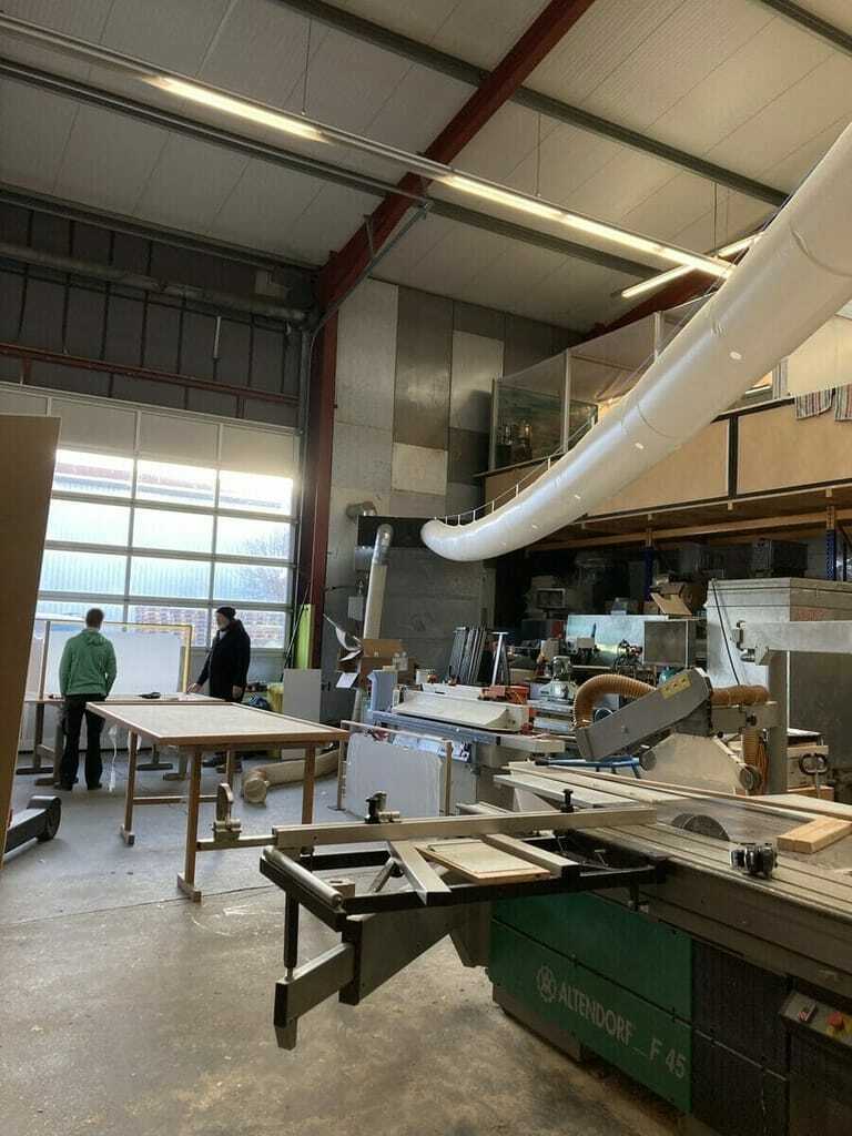 In der mit Neonröhren beleuchteten 517 Quadratmeter großen Halle ist es warm. Die große Heizung in der linken Ecke bläst im ruhigen Brummen heiße Luft aus. Es riecht nach Holzspänen und frischem Öl. Auf dem grauen Betonboden, auf dem vor allem um die Kreissäge hellbraune, kleine Sägespäne verteilt sind, liegen kleine Holzstückreste und zusammen geknülltes Klebeband. Auf den ersten Blick sieht es ziemlich voll und ungeordnet aus. Stühle, Leitern, große und kleine Maschinen, Platten, Europaletten, Regale, Werkzeuge. "Ich muss immer den Überblick haben", meint der Messebauer, "aber, wenn ich was nicht weiß, muss und kann ich mich auf Manu verlassen – der weiß, wo alles ist." Manuel Kudzus, der einzige Festangestellte von Harald Schubert, ist schon seit seiner Praktikanten- und Ausbildungszeit im Betrieb.