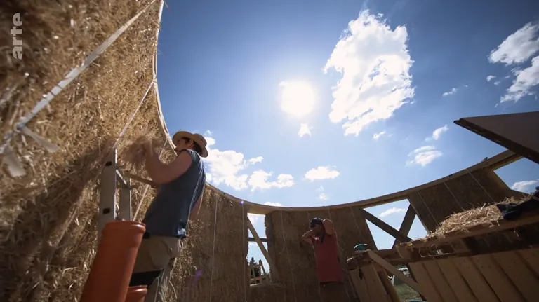 Arbeiten an den Rundwänden des nachhaltigen Hauses, das komplett aus Stroh und Lehm gefertigt wird. - © Screenshot/ARTE/Re: Strom, Lehm, kein Abfall: Der Traum vom nachhaltigen Bauen