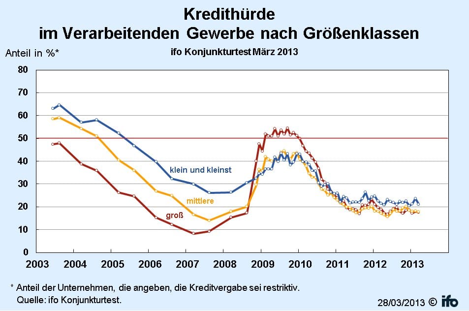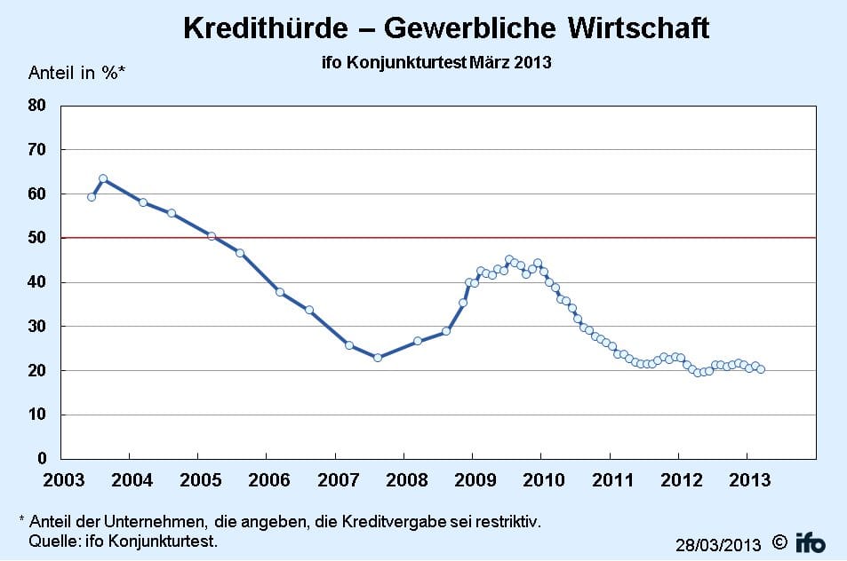 Unternehmen in Deutschland kommen nach den Ergebnissen des Konjunkturtests des Münchener Ifo-Instituts weiter günstig an Bankkredite. Die Kredithürde für die gewerbliche Wirtschaft ist im März um 0,8 Prozentpunkte auf 20,2 Prozent gefallen.