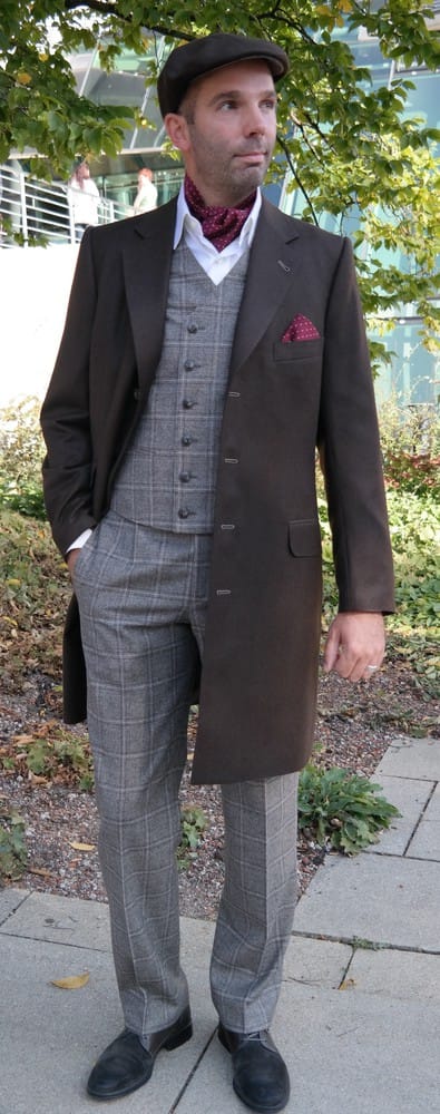 "Ich liebe diesen englischen Stil, deshalb spiegelt er sich nicht nur in meiner Mode, sondern auch in der Einrichtung meines Ateliers wider", sagt die Herrenschneidermeisterin Schönherr, die die einzelnen Bestandteile des Dreiteilers, zu dem auch die passende Hose gehört, beschreibt. Sie ist die Inhaberin der Maßschneiderei "Der schöne Herr". Ihr Ausstellungsstück hat sie gemeinsam mit einem ehemaligen Auszubildenden genäht und dafür im Atelierwettbewerb des Bundeskongresses der Maßschneider 2014 eine Goldmedaille erhalten.