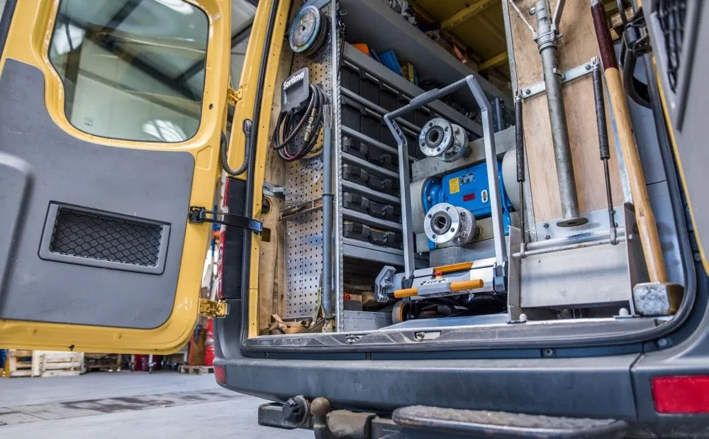 Um den Xetto optimal zu nutzen, haben Willnecker und seine Mitarbeiter sogar den Laderaum ihres Transporters umgebaut. Die Regale auf der linken Seite haben nun verschiedene Tiefen. Die entstandene Kante dient der formschlüssigen Ladungssicherung für den Xetto.
