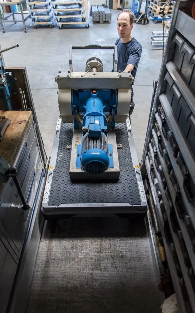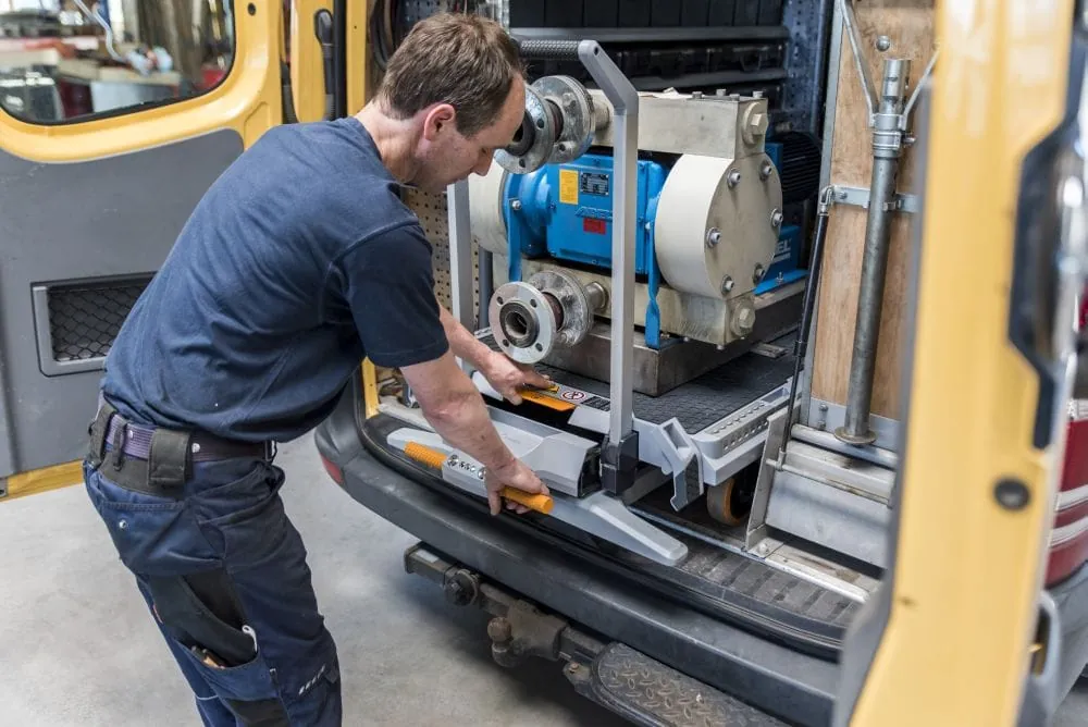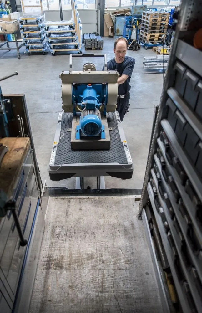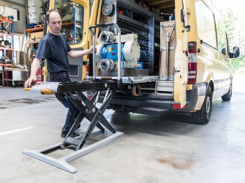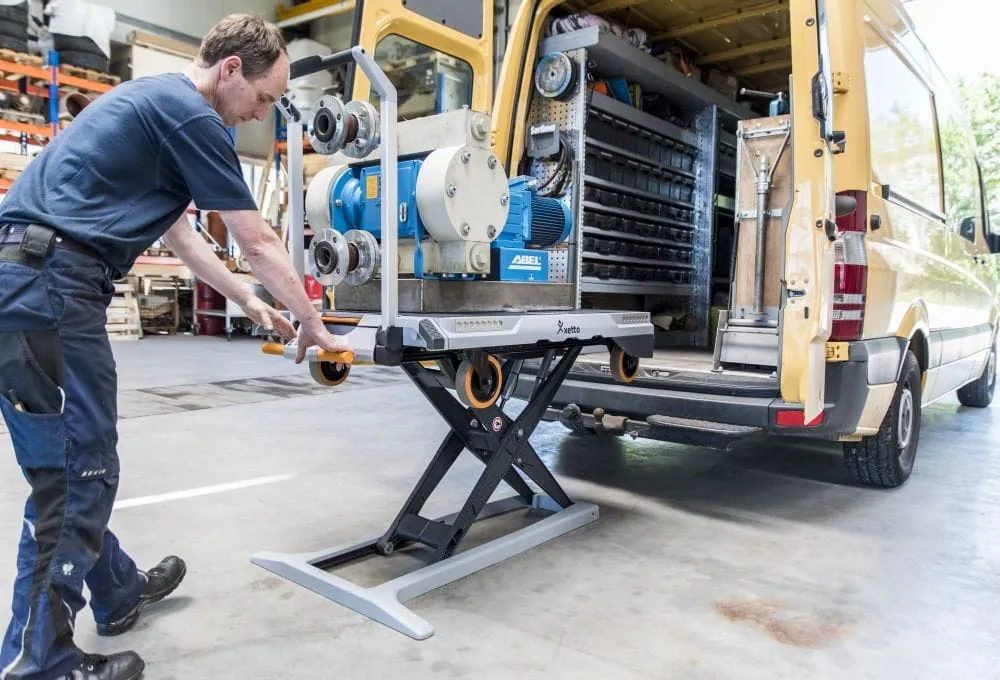 Alles, was für den Auftrag benötigt wird, können die Maschinenbauer in ihrer Werkstatt auf den Xetto packen und mit Zurrgurten sichern. Über eine hydraulische Hubfunktion lässt sich die Last anheben und in den Transporter schieben. Die Scherenkonstruktion, die die Hubkraft überträgt, kann anschließend nach oben gefahren und unter der Ladung verstaut werden. Am Ziel folgt der gleiche Ablauf in umgekehrter Reihenfolge. Anschließend lässt sich der Xetto mit geringem Kraftaufwand bis zum Einsatzort rollen.