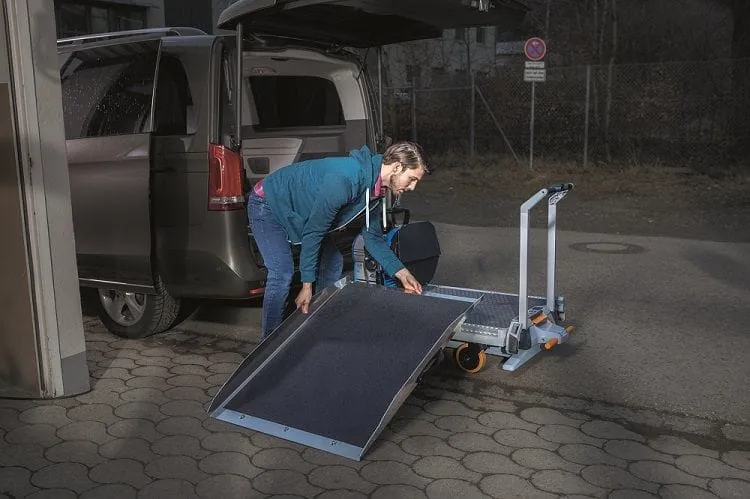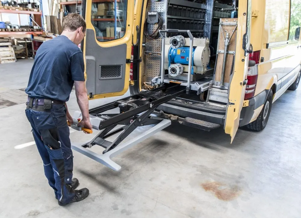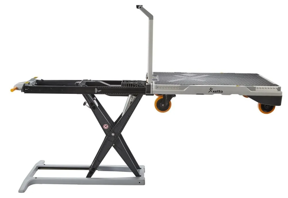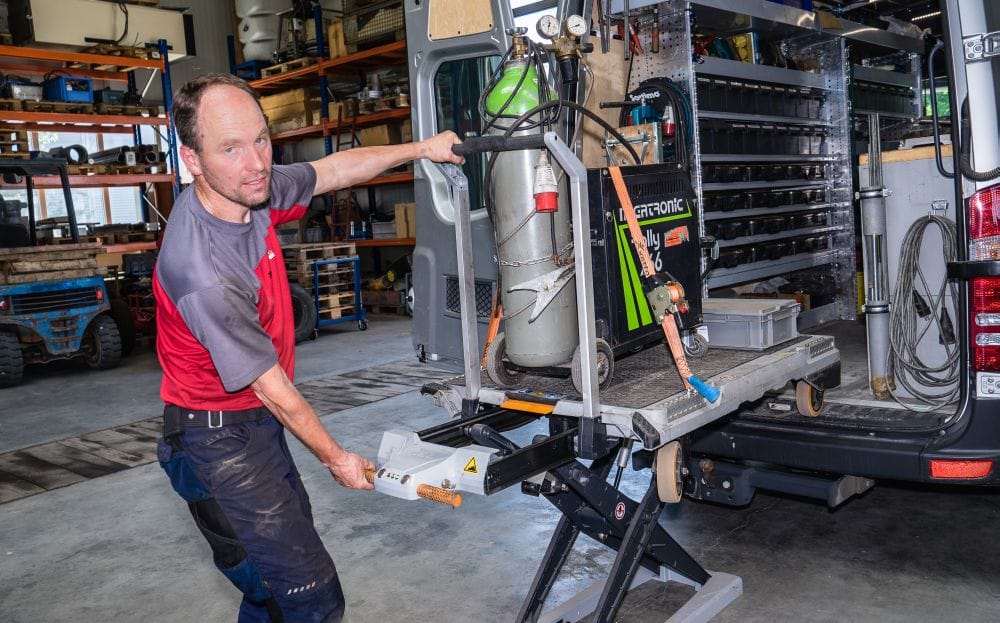 Dass es trotzdem noch Verbesserungsbedarf gibt, hat die Praxis im betrieblichen Alltag ebenfalls gezeigt. Noch muss sich Willnecker beim Absenken des Xetto bücken. Das neue Modell lässt sich aber dank einer zweiten Steuereinheit auf Höhe des Handgriffs komplett im Stehen bedienen. Dazu gibt es eine seitliche Auffahrrampe, über die sich schwere Geräte auf Rollen auch ohne Kran auf den Xetto bugsieren lassen.