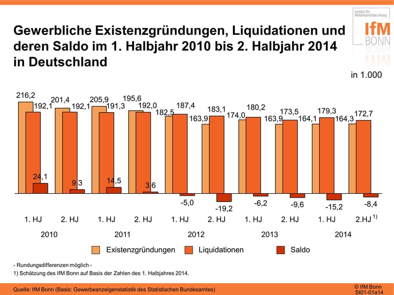 Das IfM Bonn schätzt, dass für das gesamte Jahr 2014 die Existenzgründungen auf rund 328.000 und der Liquidationen auf rund 352.000 zurückgehen. Das hätte wiederum einen negativen Gründungssaldo zur Folge.