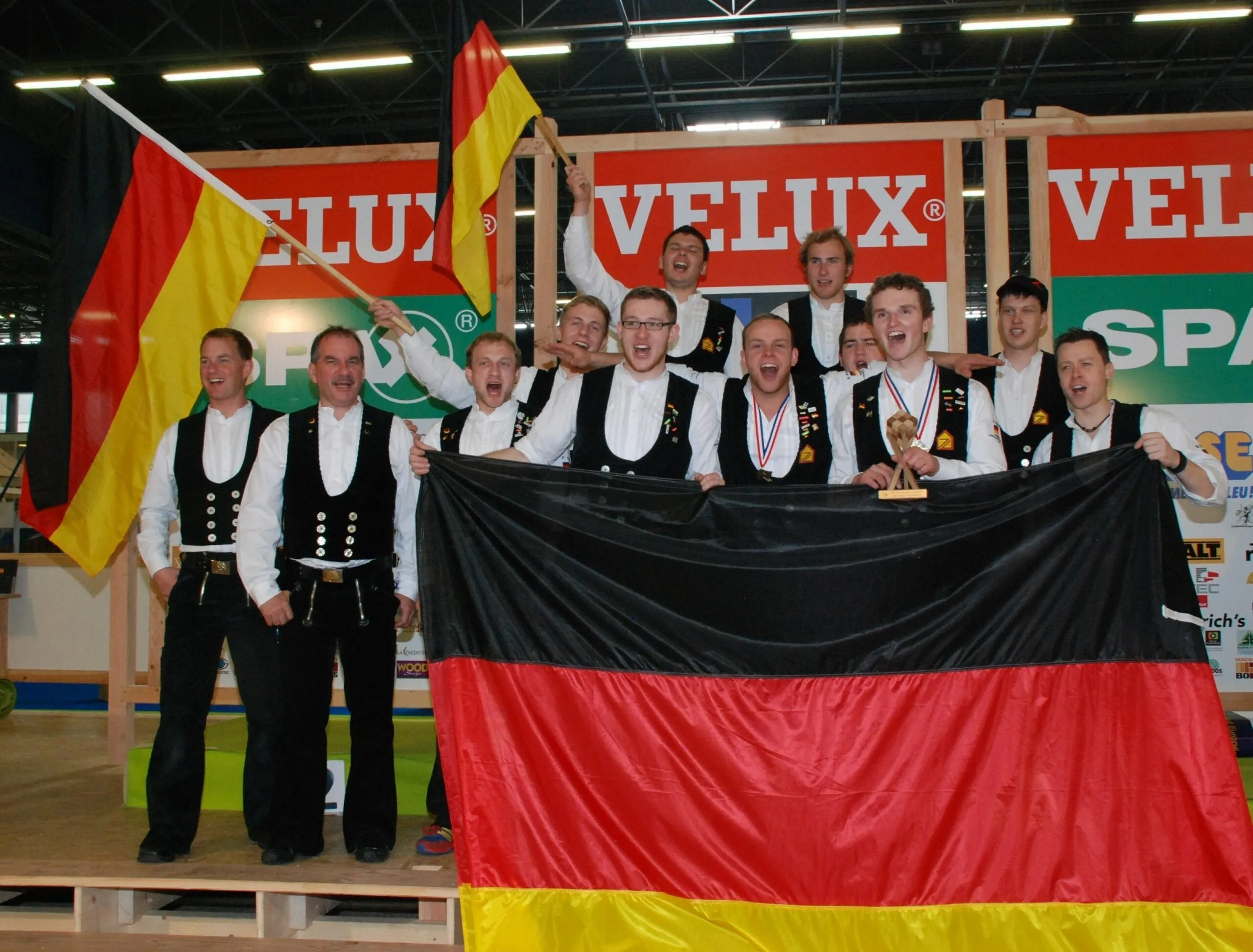 Martin Fricke, Kevin Weidner und Simon Rehm (erste Reihe, v. l.) jubeln zusammen mit ihren Mannschaftskollegen in Grenoble. Sie haben die Europameisterschaft der Zimmerer gewonnen.