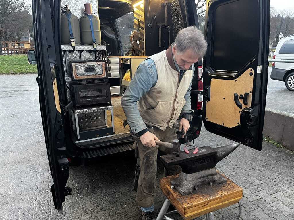 Nachdem auch bei Mondy die Hufpflege gemacht wurde, kann im nächsten Schritt mit dem Beschlagen begonnen werden. Dafür bringt Sven die Hufeisen zu seinem Transporter und legt sie in einen kleinen Ofen, um sie zu erhitzen und formbar zu machen. Mit einem Hammer schlägt er die Hufeisen dann auf einem Amboss in die richtige Form. Wichtig hierbei ist, dass nach der Form des Hufes gerichtet wird, denn "der Huf wird nicht nach dem Eisen gerichtet, sondern das Eisen anhand des Hufs", sagt Sven Schnese. Nun sind die Hufeisen fertig und werden mit Hufnägeln an den Hufen von Mondy befestigt. Im Anschluss an den Hufbeschlag sind alle Hufschmiede dazu verpflichtet, das Laufen des Pferds zu überprüfen, weshalb Sven noch eine Runde mit dem Pony geht. Dadurch wird abgesichert, dass die neue Form des Hufeisens dem Pferd keine Probleme bereitet, sondern es beim Laufen unterstützt. Das Handwerk des Hufschmieds ist schon mehr als 5.000 Jahre alt und weist daher eine wahre Tradition mit seinen Arbeitsabläufen auf, allerdings gibt es auch immer wieder neue Techniken und Materialien.
