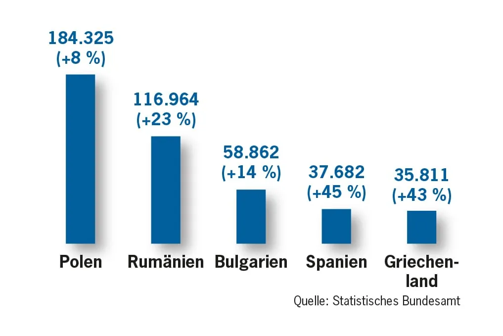 So stieg die Zahl der Zuwanderer aus Spanien 2012 um 45 Prozent, aus Griechenland und Portugal um jeweils 43 Prozent. Nach wie vor kommen aber die meisten Zuzügler aus Polen. Aus Rumänien und Bulgarien, die auf den Plätzen zwei und drei der Herkunftsländer liegen, siedelten im vergangenen Jahr insgesamt knapp 176.000 Menschen nach Deutschland um.