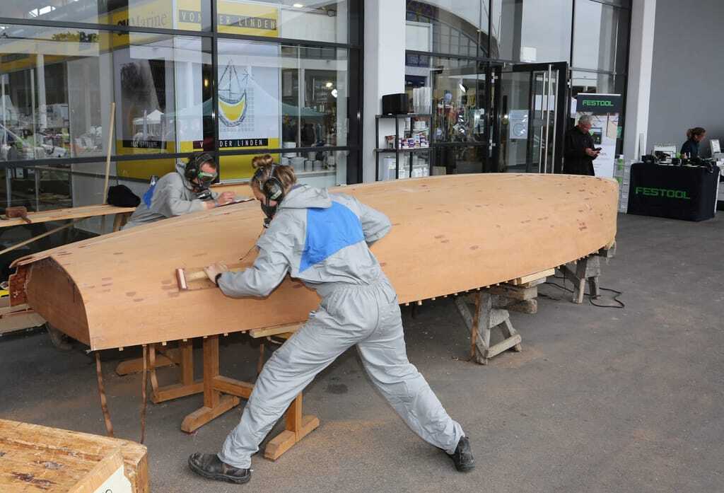 "Als wir das entschieden hatten, gab es keinen Tag mehr, an dem wir nicht an dem Boot gearbeitet hätten", sagt Böckenhoff. Jede Minute ihrer Freizeit steckten sie in die Jolle, in Summe mindestens 4.000 Stunden. Eine befreundete Lieferfirma war von dem Projekt so angetan, dass sie nicht nur kostenlos Material, sondern auch einen Aktionsstand auf der Messe Interboot stellte. "Dort arbeiteten wir an der Jolle weiter und konnten gleichzeitig Kontakte knüpfen", erklärt Winter, wie wichtig die Messe für das Projekt war. Denn die Azubis brauchten Sponsoren: Holz, Beschläge, Motor, Kleber, Lacke und Epoxid, auch winterfeste Segelkleidung und logistische Hilfe waren vonnöten. Reihenweise verschickten sie Mails an potenzielle Geldgeber und stießen auf diese Weise auch ein zusätzliches Azubi-Projekt in Hamburg an: Die Segelmacher-Azubis von Clownssails nähten das Tuch für sie.