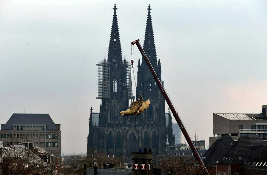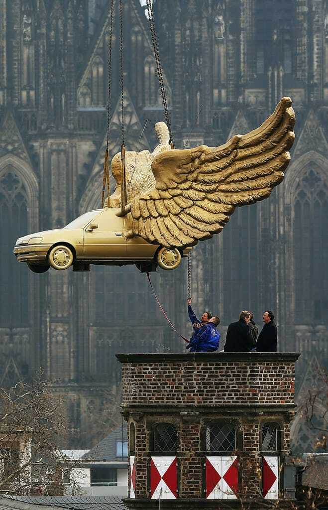 Kölns goldenes Wahrzeichen ist zurück: Das Flügelauto des Aktionskünstlers HA Schult thront seit Donnerstag wieder auf dem Turm des Kölner Stadtmuseums. Ein Kran hievte das vier Tonnen schwere Kunstwerk auf seinen angestammten Platz über den Dächern der Stadt.