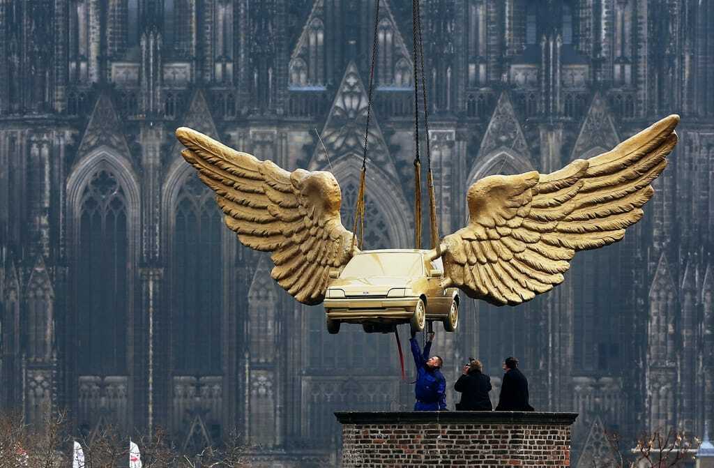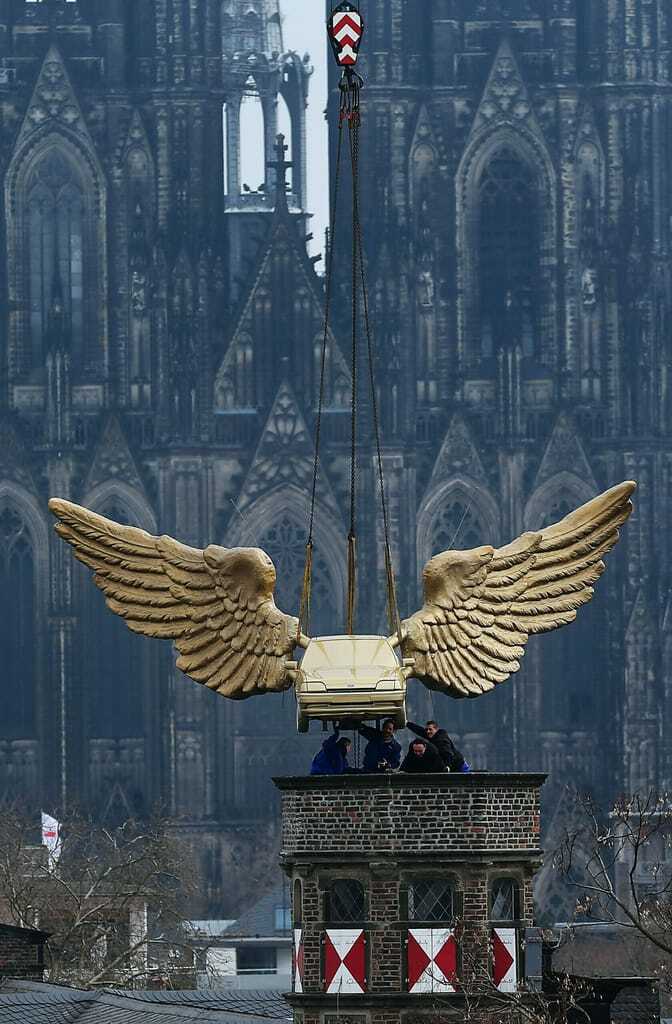 Seit November 2012 hatten zwölf Auszubildende der Kölner Ford-Werke den vergoldeten Ford Fiesta mit den zehn Meter breiten Polyesterharz-Flügeln restauriert und gereinigt. Auch der Turm des Stadtmuseums war repariert worden.
